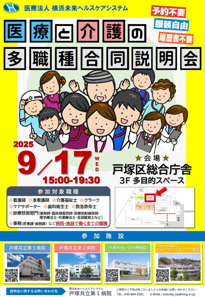 9月17日(水)合同就職説明会開催 投稿日 2025年9月14日 著者 ヒューマンライフケア横浜管理者 カテゴリー お知らせ 15時~19時30分、戸塚区総合庁舎3階多目的スペースにて就職説明会を行います。 職種は問いませんので、お気軽にお越しください