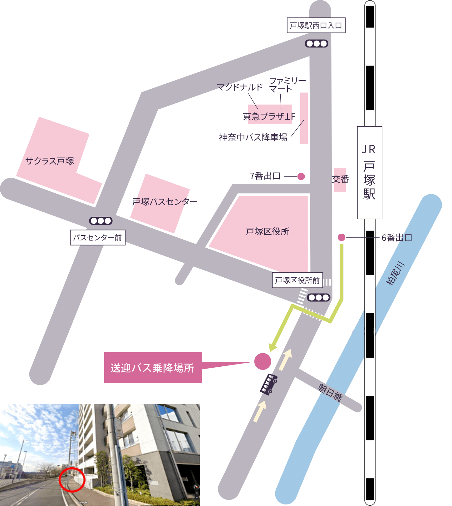 戸塚駅からの送迎バスは、西口(「地下改札」を出て左、一番手前の【6番出口階段】を上がった先の信号を渡った先)より発車いたします。